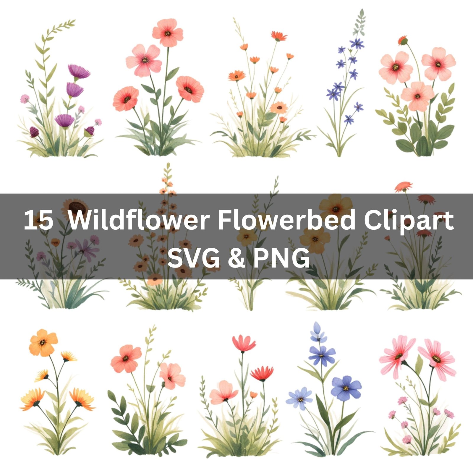 15 PNG Wildflower Flowerbed Clipart Set – Watercolour Printable Graphics